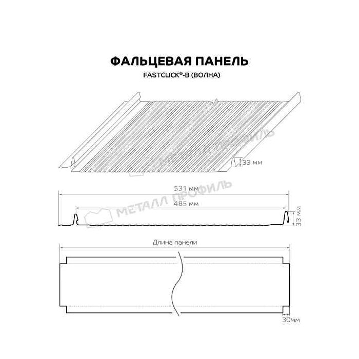 Что касается габаритов, то Фальцевая панель Металл Профиль FASTCLICK-В (VikingMP E-20-3005-0.5) обладает удобными параметрами: лёгкую картину шириной 531 мм удобно устанавливать, а замки высотой 33 мм обеспечивают надёжное и герметичное соединение. Длину панели можно выбрать, она варьируется от 0,5 до 12 метров.