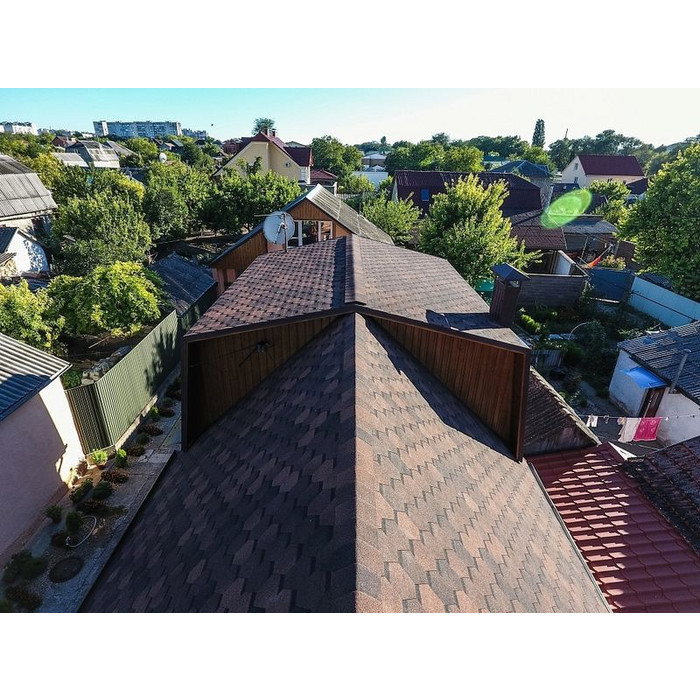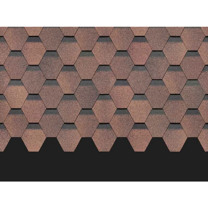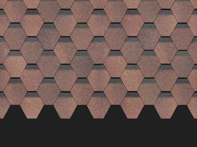 Натуральные кофейные оттенки и строгая шестиугольная форма лепестков гонтов делают черепицу универсальной в дизайне. Она сделает выразительной простую двухскатную крышу и подчеркнет красоту кровли с декоративными деталями. Удачные сочетания с бежевыми, светло-зелеными, терракотовыми тонами.