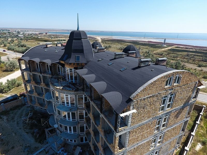 Гонты глубокого серого цвета с лепестками традиционной формы отлично подходят для оформления крыш сложной конфигурации. Черепица подчеркивает красоту деталей, при этом делает кровлю визуально более компактной. Она идеально сочетается с нейтральными светлыми оттенками и фасадами более насыщенных тонов.
