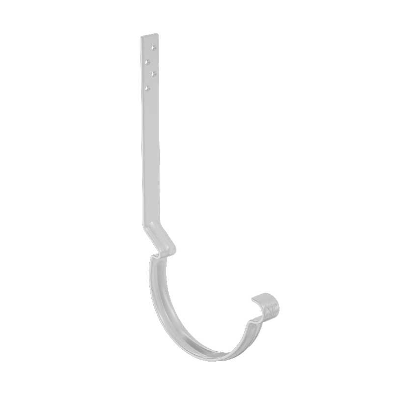 Поставляется с комплектом креплений. Конструкция крюка имеет более вытянутое и глубокое ребро жесткости, поэтому крюк выдерживает повышенные силовые нагрузки. Передний замок крюка фиксирует завиток желоба снаружи, и благодаря этому желоб удобно монтировать даже после установки фартука-капельника. Задний замок имеет конструкцию, исключающую смещение желоба под нагрузкой. Отверстия под крепеж выполнены с зенковкой под шляпку в потай. На передней части крюка расположен фирменный штамп - лилия.