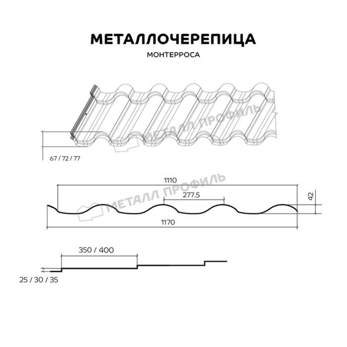 МОНТЕРРОСА подходит для кровель в разных стилях. Глубина профиля увеличена до 77 мм. Это асимметричный профиль, значит, в зависимости от точки обзора, внешний вид крыши отличается. С указанным кровельным материалом крыша станет значительно заметнее. Можно выбрать необходимую комбинацию длины (350, 400 мм) и высоты (25, 30 и 35 мм) ступеней, чтобы создать нестандартную крышу, которая подчеркнёт оригинальность дома. Разработчики оптимизировали форму листа и увеличили полезную площадь. МОНТЕРРОСА обрабатывается декоративно-защитными слоями классов Премиум и Премьер. Пусть красивая и надёжная крыша радует ваш взгляд!