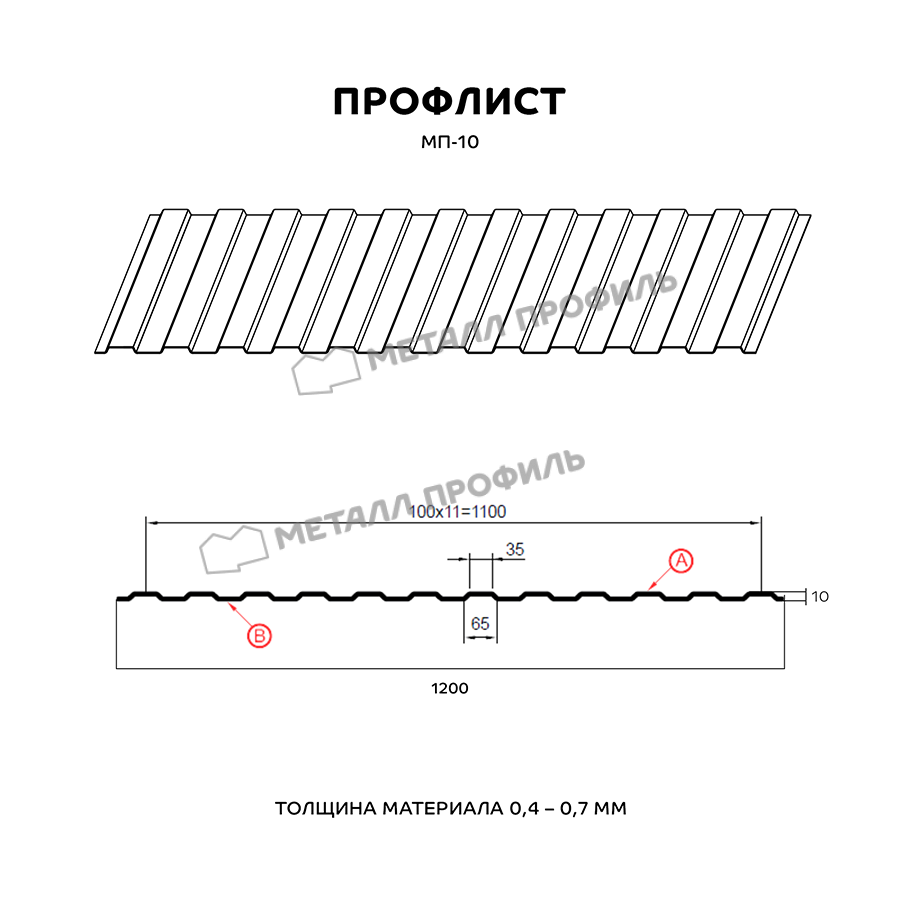 МП-10 – один из классических видов стенового профиля. Он отлично смотрится в виде стенового материала, подвесного потолка в нежилых помещениях, забора, декоративного ограждения, вентилируемого фасада. Профлист обладает трапециевидной формой волны, одинаковой на сторонах А и В. Глубина волны – 10 мм, что не придаёт металлопрокату высокой способности выдерживать большие нагрузки, но при обшивке фасадов это не самое главное. Зато лаконичный рельеф профилированного листа не создаёт постройке индустриальный облик. На прочностные характеристики можно воздействовать, заказав ту или иную толщину металлопроката. МП-10 прокатывается в толщинах от 0,4 до 0,7 мм. Увеличить антикоррозионную защиту способен защитный полимерный слой. Покрытие не только отличается насыщенным цветом, стойким к выгоранию под ультрафиолетом, но и предотвратит мелкие механические повреждения и ржавение стальной основы.